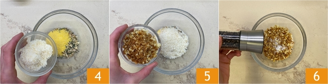 Añadid el Parmesano rallado 4 y el pan rallado rústico 5; después rectificad de sal y pimienta 6.