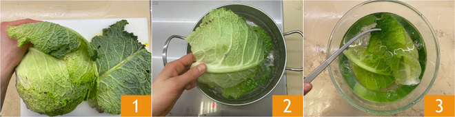 Para preparar los rollitos de col rellenos de arroz y calabaza, primero separa las hojas más grandes de la col 1 y escáldalas durante unos minutos 2, luego sumérgelas en un bol con agua fría y hielo 3; de esta manera el color se mantendrá brillante. Escurre las hojas de col y déjalas secar sobre una rejilla.