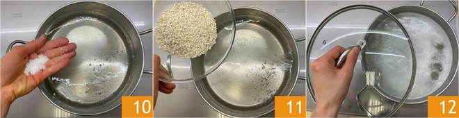 Ahora dedícate a cocinar el arroz: lleva a ebullición una olla con agua, luego sala 10 y vierte el arroz 11. Cubre con la tapa y cocina a fuego bajo durante 15 minutos 12. Pasado este tiempo, apaga el fuego y deja reposar, siempre con la tapa: el arroz debe absorber toda el agua.