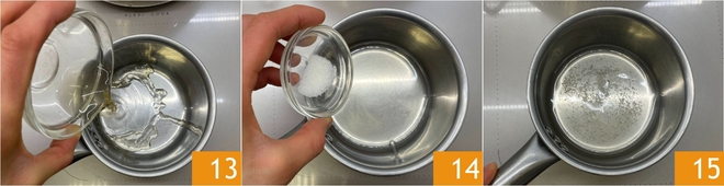 Mientras tanto, en un cazo, vierte el vinagre de manzana 13, el azúcar 14 y la sal. Remueve y calienta para disolver todo, sin llegar a ebullición 15.