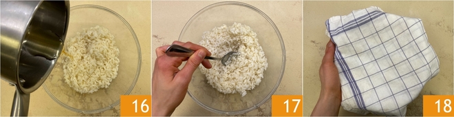 Cuando el arroz esté listo, transfiérelo a un bol y condimenta con la mezcla de vinagre 16, mezcla bien 17 y cubre con un paño húmedo 18. Deja enfriar.