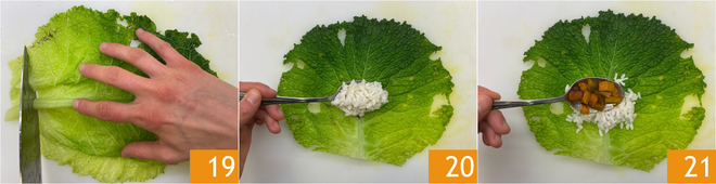 Estás listo para ensamblar los rollitos: extiende una hoja de col sobre la superficie de trabajo y corta la parte final del tallo 19, luego rellena con una cucharada de arroz en el centro 20 y una cucharada de calabaza 21.