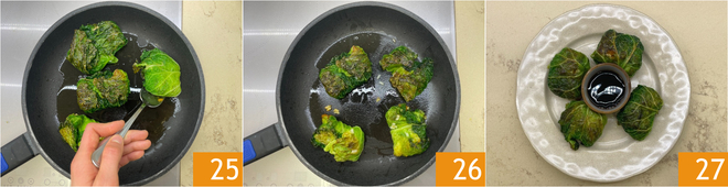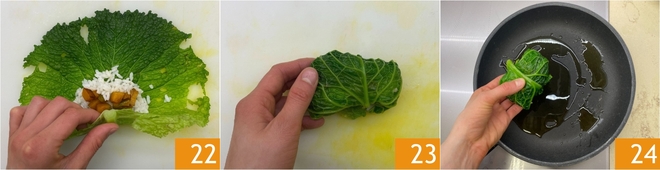 Enrolla la hoja de col sobre sí misma 22 y dobla los extremos hacia adentro para sellar el relleno 23. Procede de esta manera para formar los otros rollitos, luego colócalos en una sartén con un poco de aceite caliente 24.