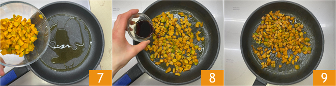Calienta un poco de aceite en una sartén, añade la calabaza 7 y sofríela durante unos minutos, luego rocía con la salsa de soja 8 y añade media cucharadita de azúcar. Deja caramelizar, después apaga el fuego y reserva 9.