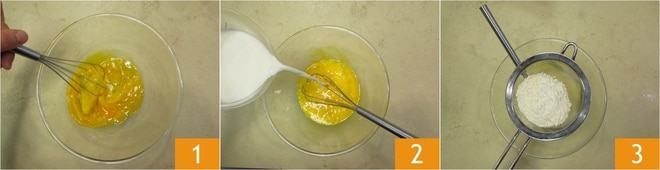 Para preparar los rollitos de crepes rellenos, comienza haciendo la masa: bate el huevo en un bol 1 con una pizca de sal, luego añade la leche 2 y mezcla con la batidora. Tamiza la harina en el bol 3.