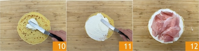 Para rellenar las crepes, colócalas sobre la tabla de cortar y unta el queso crema Philadelphia de manera uniforme sobre toda la superficie 10 11. Coloca encima 2 lonchas de jamón cocido 12.