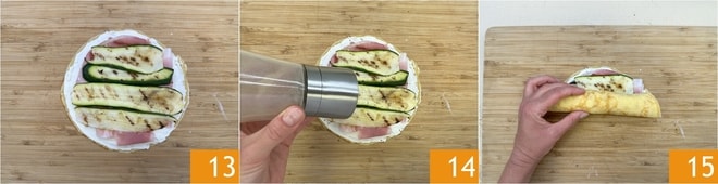 Añade también los calabacines a la parrilla 13 y, si lo deseas, un poco de pimienta negra molida 14. Enrolla delicadamente la crepe, presionando ligeramente para que el relleno se adhiera bien 15.