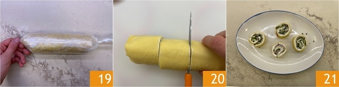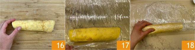 Una vez obtenido un rollito 16, envuélvelo bien con film transparente 17 18.