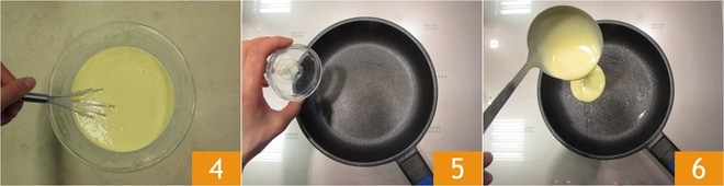 Agrega también el Parmesano rallado y mezcla nuevamente, hasta obtener una mezcla lisa y sin grumos 4. Cubre el bol con film transparente y deja reposar en el frigorífico durante al menos media hora. Pasado el tiempo de reposo, calienta una sartén antiadherente y derrite una nuez de mantequilla 5. Vierte un cucharón de masa en la sartén 6 y gírala para distribuirla uniformemente en la base. Cocina durante aproximadamente un minuto, levantando los bordes de la crepe con una espátula, luego gírala al otro lado para que se dore uniformemente.