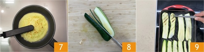Una vez cocida 7, transfiere la crepe a un plato y continúa cocinando todas las demás hasta agotar la masa; con estas cantidades deberías obtener 4. En este punto, lava bien los calabacines bajo agua corriente, cortales los extremos y córtalos en sentido longitudinal en rodajas finas de aproximadamente 2-3 mm 8. Calienta una plancha y asa las rodajas por ambos lados, hasta que estén tiernas y ligeramente doradas 9, luego déjalas enfriar.