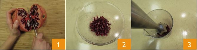 Para preparar los rollitos salados de hojaldre con granada, lo primero que hay que hacer es ocuparse de la granada: corta la mitad 1, desgránala 2 y tritura los granos con una batidora de mano 3.