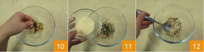 Desmenuza las castañas con las manos 10, añade el tomillo deshojado, el Parmesano 11, mezcla bien 12 y reserva.