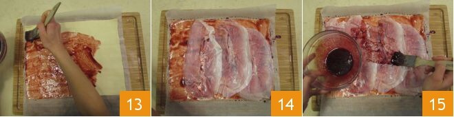 Desenrolla la masa de hojaldre y úntala con la reducción de granada 13. Coloca encima aproximadamente la mitad del jamón 14 y unta nuevamente con la reducción 15.