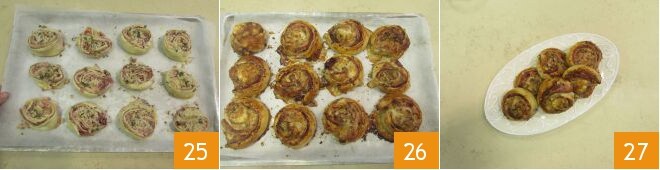 En este punto 25 hornea en un horno estático precalentado a 200° durante unos 25-30 minutos hasta que estén bien dorados. Saca del horno 26 y sirve tus deliciosos rollitos de hojaldre salados con granada 27.