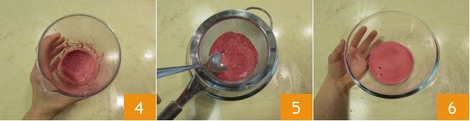 hasta obtener una mezcla homogénea 4 que tamizarás 5 para obtener solo el jugo 6.