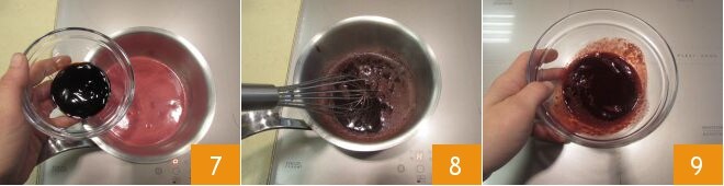 Transfiere el jugo de granada a un cazo, añade la glasa de vinagre balsámico 7 y deja reducir a fuego lento, removiendo a menudo 8. Luego transfiere al interior de un bol y deja enfriar 9.