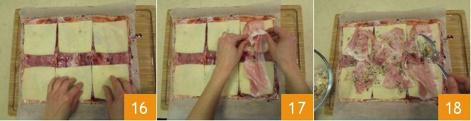 Coloca encima las lonchas de queso 16, el jamón restante 17 y aproximadamente la mitad de la mezcla de castañas y Parmesano 18.