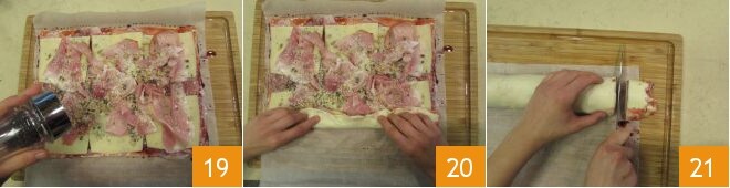 Condimenta con la pimienta negra 19 y enrolla el hojaldre por el lado más largo 20. Divide el rollo obtenido en 12 rollitos 21.