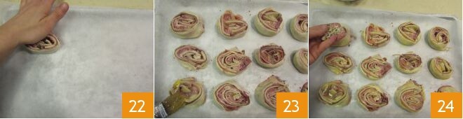 Coloca los rollitos en una bandeja para horno forrada con papel de horno y aplástalos un poco con las manos 22. Unta la superficie con el huevo batido 23 y espolvorea con la mezcla de castañas y queso 24.