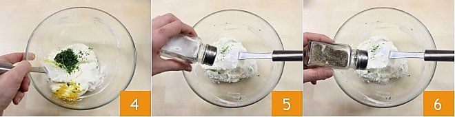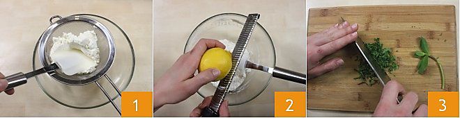 Incorporad la menta picada a la ricotta cremosa y a la ralladura de limón 4 y mezclad hasta obtener una mezcla homogénea; salad y pimentad al gusto (5-6). Conservadla en el frigorífico, cubierta con film transparente, hasta el momento de usarla.