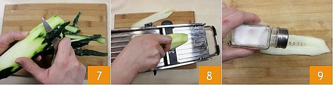 A continuación, lavad y pelad el pepino (de unos 200 g) 7 y cortadlo a lo largo con una mandolina, intentando obtener láminas bastante finas y flexibles para poder enrollarlas 8. Si no tenéis mandolina, podéis cortar el pepino a lo largo con un cuchillo bien afilado, con mucho cuidado. Salad, pues, cada loncha de pepino 9.