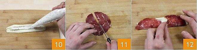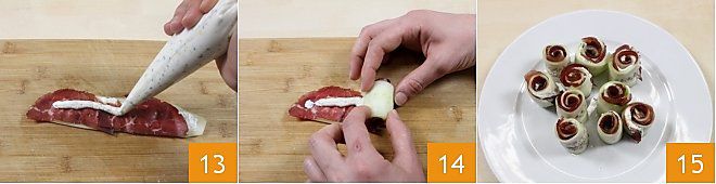 Trasladad la mezcla de ricotta, ralladura de limón y menta picada a una manga pastelera y exprimidla sobre las láminas de pepino saladas 10. Por otra parte, cortad una loncha de bresaola por la mitad 11 y colocadla sobre la lámina de pepino, presionando para que se adhiera a la capa de crema de ricotta extendida previamente 12.