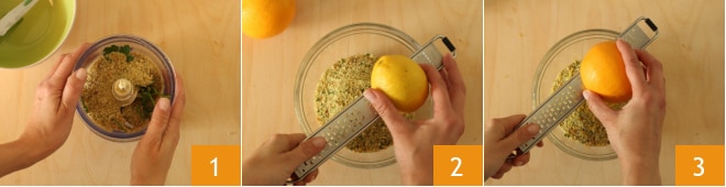 Para preparar los rollitos de pollo con puerros y cítricos, lo primero que debes hacer es ocuparte del relleno. En el recipiente de una batidora, vierte el pan rallado, una pizca de sal, una pizca de pimienta, el perejil y el ajo pelado 1. Tritura todo y transfiere a un bol, añade la ralladura de medio limón 2 y la de media naranja 3.