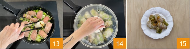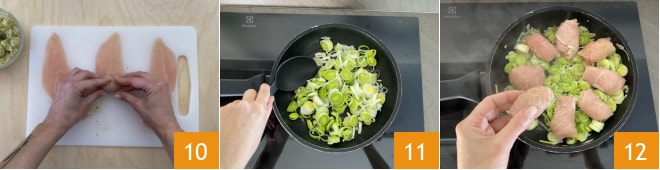 Luego enróllalas para formar los rollitos 10. Calienta el aceite en una cazuela, añade el puerro y déjalo pochar a fuego lento durante unos minutos 11. Luego sube el fuego, coloca los rollitos con el cierre hacia abajo 12.