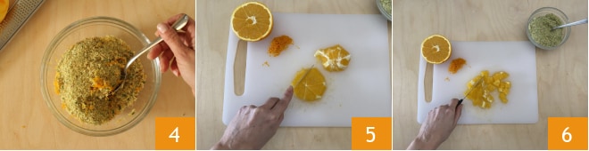 Mezcla 4 y reserva un momento. Ralla la ralladura del limón y de la naranja restantes y resérvalas para la decoración. Corta la naranja por la mitad y pélala al vivo 5, luego córtala en cubitos 6