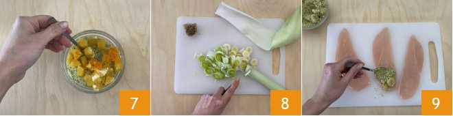 y transfiérala al bol con la mezcla de pan rallado 7. Mezcla y reserva. Elimina del puerro la parte de las raíces, quítale las hojas más duras y córtalo en rodajas. Lávalo y escúrrelo bien. Ahora pasa a la composición de los rollitos. Extiende las lonchas de pollo sobre una tabla de cortar y coloca una cucharada de relleno al inicio de cada loncha 9.