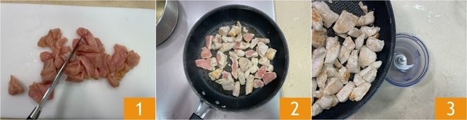 Para preparar los rollitos de pollo frito con salsa y verduras, lo primero que hay que hacer es cortar la pechuga de pollo en trozos 1. Dorarla en una sartén antiadherente 2 durante unos diez minutos, salar y pimentar. Cocinar el pollo hasta que esté hecho, luego verter los trozos en un procesador de alimentos 3.