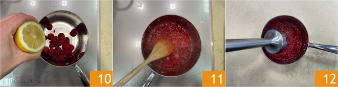 Mientras tanto, preparar las diferentes salsas. Comenzar con la de frambuesas. Verter las frambuesas en un cazo, añadir el zumo de limón 10 y el agua. Cocinar a fuego medio durante unos 5 minutos, removiendo con frecuencia 11 hasta que se deshagan. En este punto, triturar con una batidora de mano 12.