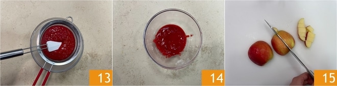 Colar la salsa obtenida con un colador 13, luego reservarla 14. Ahora preparar la de manzanas: lavarlas, quitar el corazón y cortarlas en cubos 15.