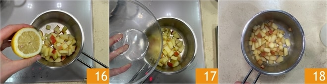 Añadir el zumo de limón 16 y la mitad de la cantidad de agua 17. Luego cocinarlas hasta que estén blandas 18, esto llevará unos 10 minutos.