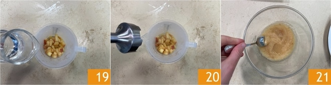 Añadir el agua restante 19 y triturar las manzanas 20. Se debe obtener una consistencia cremosa 21; reservar.
