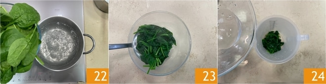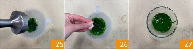 Escaldar las espinacas en agua con sal 22 durante unos segundos. Escurrirlas y transferirlas a un bol con agua y hielo 23. Escurrirlas nuevamente, transferirlas a un recipiente alto y estrecho y añadir el agua 24.