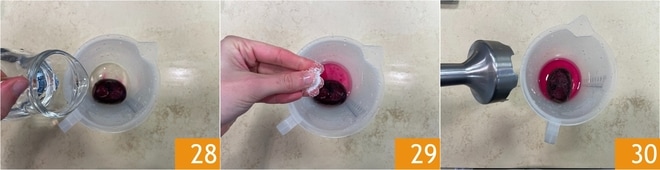 Preparar la última salsa. Colocar la remolacha en un recipiente alto y estrecho, añadir el agua 28, la sal 29 y triturar con una batidora de mano 30. Reservar también esta salsa.