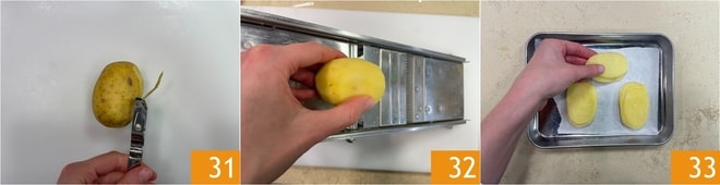 Pasar a las patatas. Pelarlas 31 y lavarlas. Cortarlas finamente con una mandolina, de modo que tengan un grosor de un par de mm 32. Realizar 4 torres de 10 rodajas cada una y colocarlas en una bandeja cubierta con papel de horno 33.