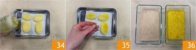 Condimentarlas con sal, aceite 34 y tomillo 35. Cocinarlas en horno estático precalentado a 200° durante 30 min. Mientras tanto, preparar los ingredientes para empanar los rollitos de pollo. Verter en un bol el pan rallado y en otro los huevos batidos 36. Cuando falten pocos minutos para que las patatas estén listas, se puede comenzar a calentar el aceite, que debe alcanzar una temperatura de 170-180°.