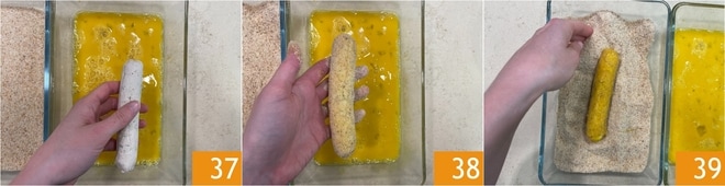 Mientras el aceite se calienta, empanar los rollitos. Pasarlos primero por el huevo 37, luego por el pan rallado, después nuevamente por el huevo y por último nuevamente por el pan rallado 39; de modo que tengan un doble empanado.