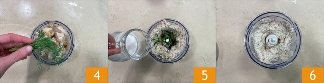 Añadir el eneldo y triturar bien, luego agregar la nata 5 y continuar triturando hasta obtener una mezcla cremosa y homogénea 6.