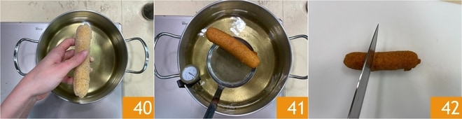 En cuanto el aceite haya alcanzado la temperatura adecuada, sumergir el primer cilindro de pollo 40. Freírlo hasta que esté bien dorado; luego escurrirlo 41 en un papel de cocina. Cortar cada cilindro en 3 rollitos 42.