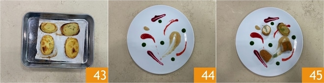 También sacar del horno las patatas ya cocidas 43, luego emplatar. Utilizar las salsas de frutas y verduras para decorar el plato 44, luego colocar encima los rollitos de pollo y decorar con ramitas de eneldo 45.