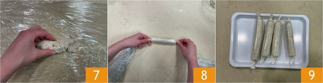 Con la ayuda de film transparente, formar cilindros enrollando aproximadamente 100 gr de mezcla en cada uno 7, apretar bien, hacer un nudo en ambos extremos 8, colocar en una bandeja 9 y meter en el congelador durante al menos 1 hora (este procedimiento ayudará a tener la mezcla más sólida para empanarla sin dificultad).