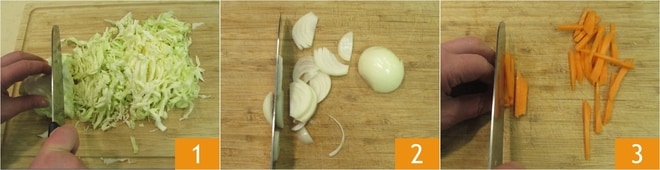 Para preparar los rollitos de primavera, primero descongela las hojas ya listas y cúbrelas con un paño ligeramente humedecido para evitar que se sequen. Lava y corta en tiras finas la col 1, las cebollas 2 y las zanahorias 3.