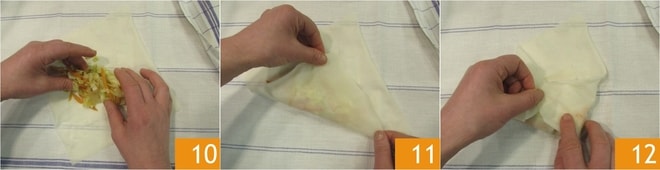 En este punto puedes componer los rollitos: coloca una hoja por vez sobre el paño con un ángulo hacia ti y añade un puñado de relleno en la mitad inferior 10. Pliega el ángulo inferior hacia arriba y envuelve sin presionar para cubrir el relleno 11, luego pliega los ángulos laterales hacia el centro 12.