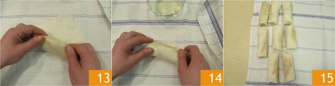 Finalmente envuelve el rollito de abajo hacia arriba 13 y sella la hoja humedeciendo los bordes con un poco de clara de huevo 14, puedes usar los dedos o un pincel. No presiones demasiado o la hoja podría romperse. Procede de esta manera para formar todos los rollitos 15.