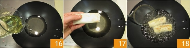 Ahora calienta nuevamente el wok, luego vierte abundante aceite vegetal 16 hasta alcanzar la temperatura de 180°C. Cuando el aceite esté a temperatura, baja ligeramente el fuego y fríe pocos rollitos por vez 17, girándolos por ambos lados 18.