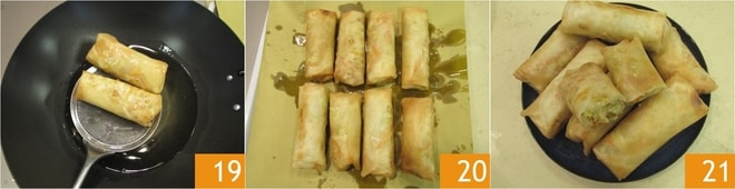Cuando estén bien dorados por ambos lados, escurre los rollitos 19 y colócalos sobre papel de cocina para absorber el exceso de aceite 20. ¡Sirve tus rollitos de primavera aún calientes acompañados con salsa picante o agridulce 21!