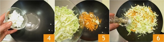 Calienta el wok a fuego alto, luego añade el aceite vegetal y las cebollas 4. Sofríe durante un par de minutos, luego agrega las zanahorias y la col 5. Condimenta con sal y pimienta 6.